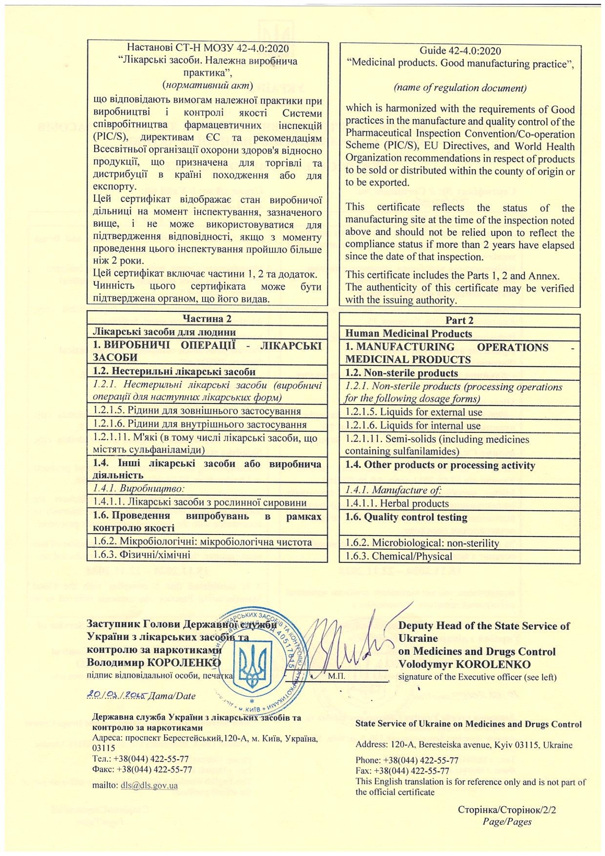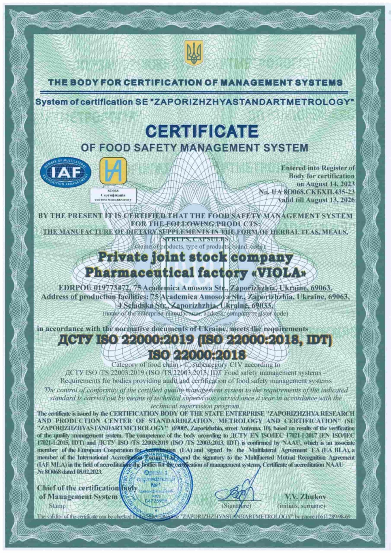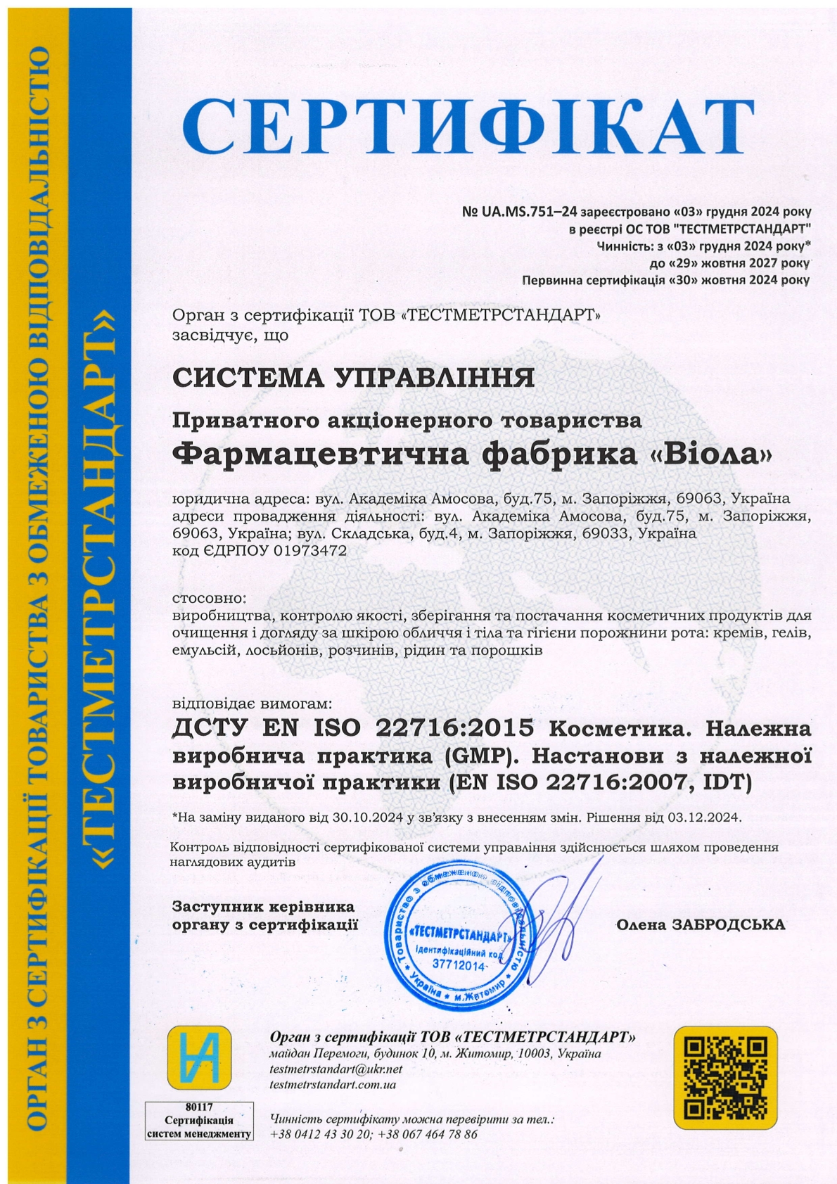The company has developed and implemented an integrated quality management system certified in accordance with the requirements of GMP, DSTU ISO 9001:2015, DSTU ISO 13485:2018, DSTU ISO 22000:2019, DSTU EN ISO 22716:2015, DSTU ISO 45000:2019, DSTU-N CAC/RCP 1:2012 (HACSR).