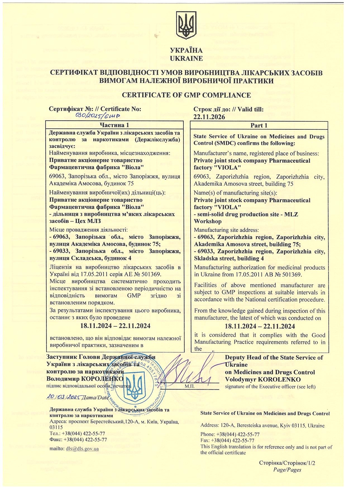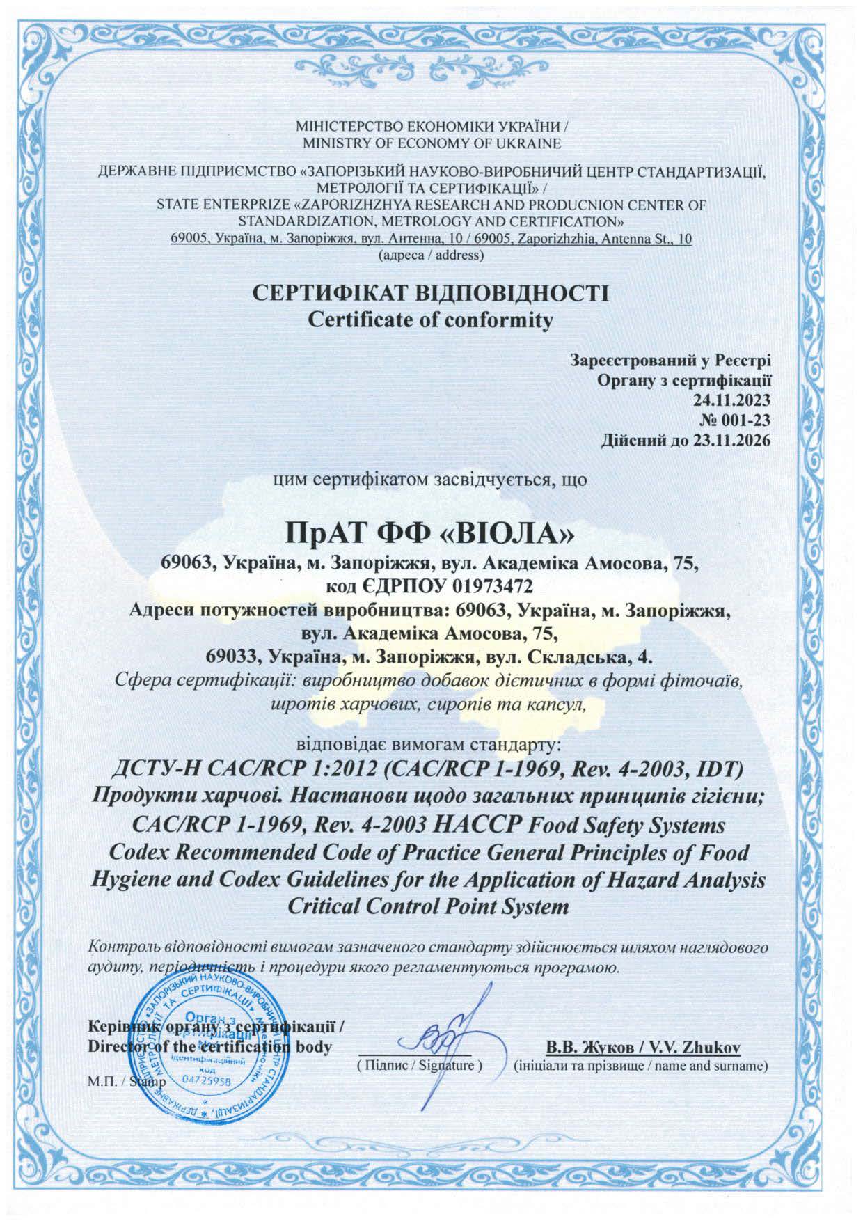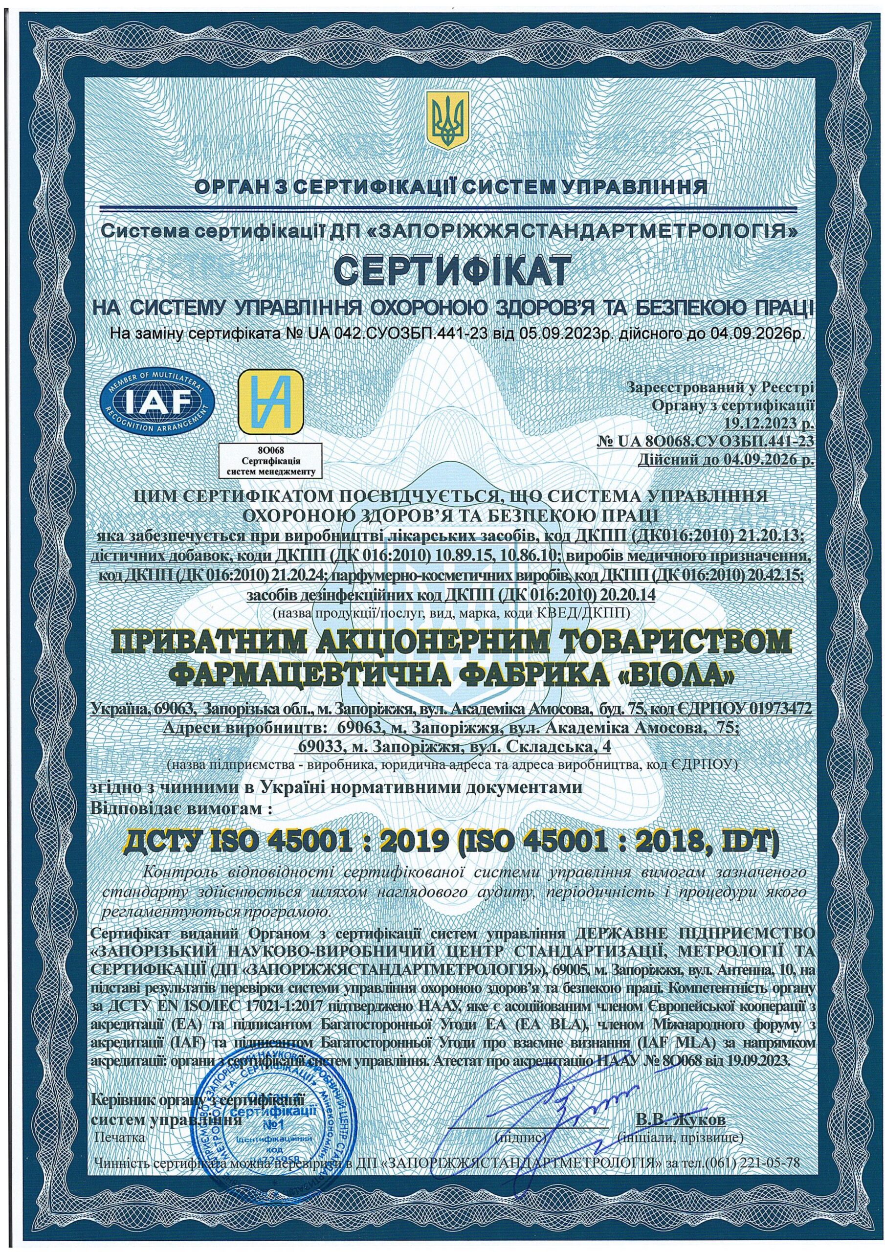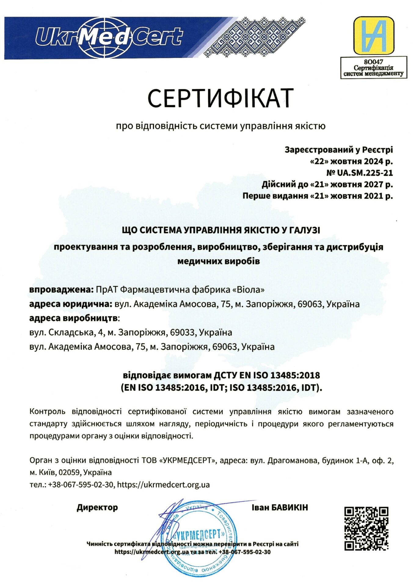 The company has developed and implemented an integrated quality management system certified in accordance with the requirements of GMP, DSTU ISO 9001:2015, DSTU ISO 13485:2018, DSTU ISO 22000:2019, DSTU EN ISO 22716:2015, DSTU ISO 45000:2019, DSTU-N CAC/RCP 1:2012 (HACSR).